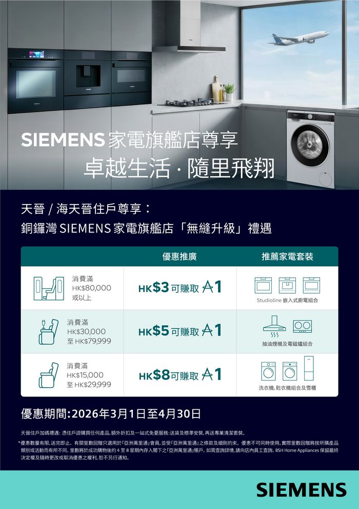- BSH Home Appliances Limited、亞洲萬里通有限公司及國泰航空有限公司保留最終決定權及修改條款之權利。